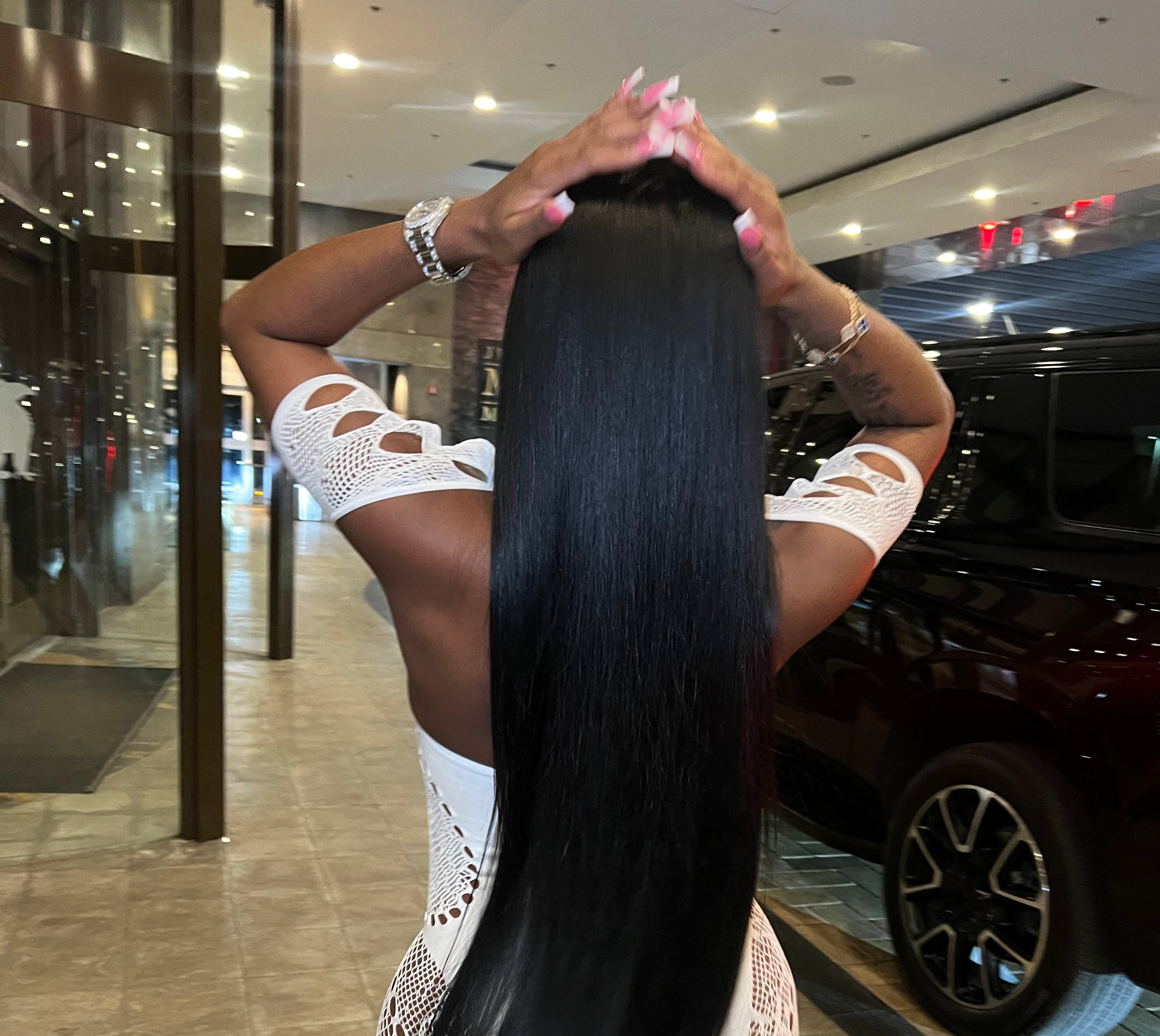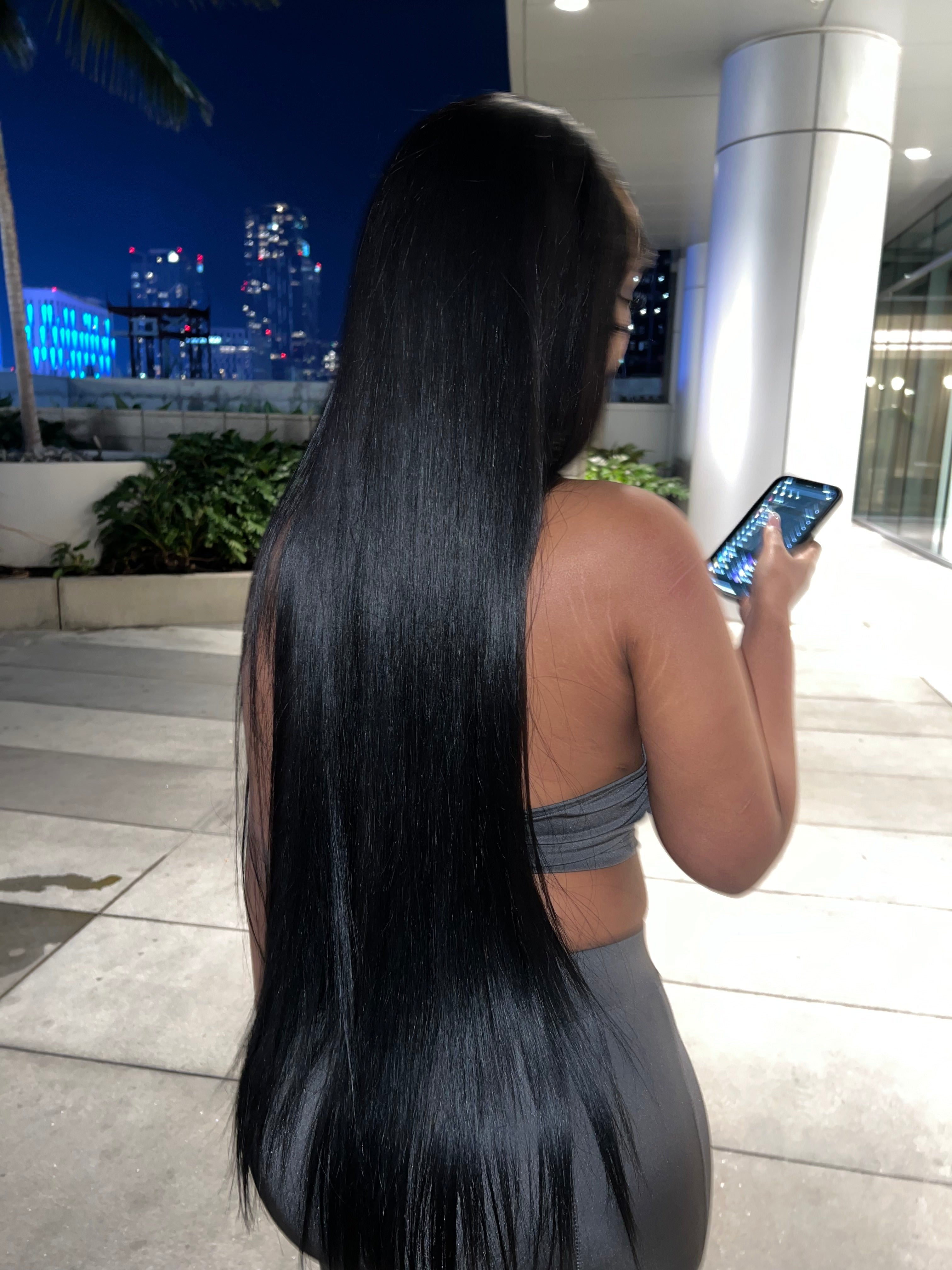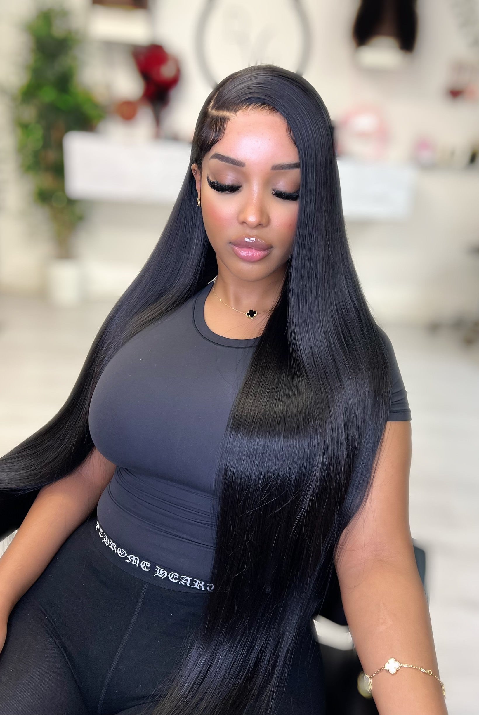 Mais raw hair will like to present you our 30" straight buss down "Kim" which is a custom wig made with the finest double drawn raw, unprocessed human hair with luxuriant thick ends. Raw hair is sourced directly from donors, ensuring that it remains in its natural state without undergoing chemical treatments. This preserves the authenticity of the hair, including its natural texture, color, and overall quality. We have the best hair quality in the market right now. Try and see for yourself.